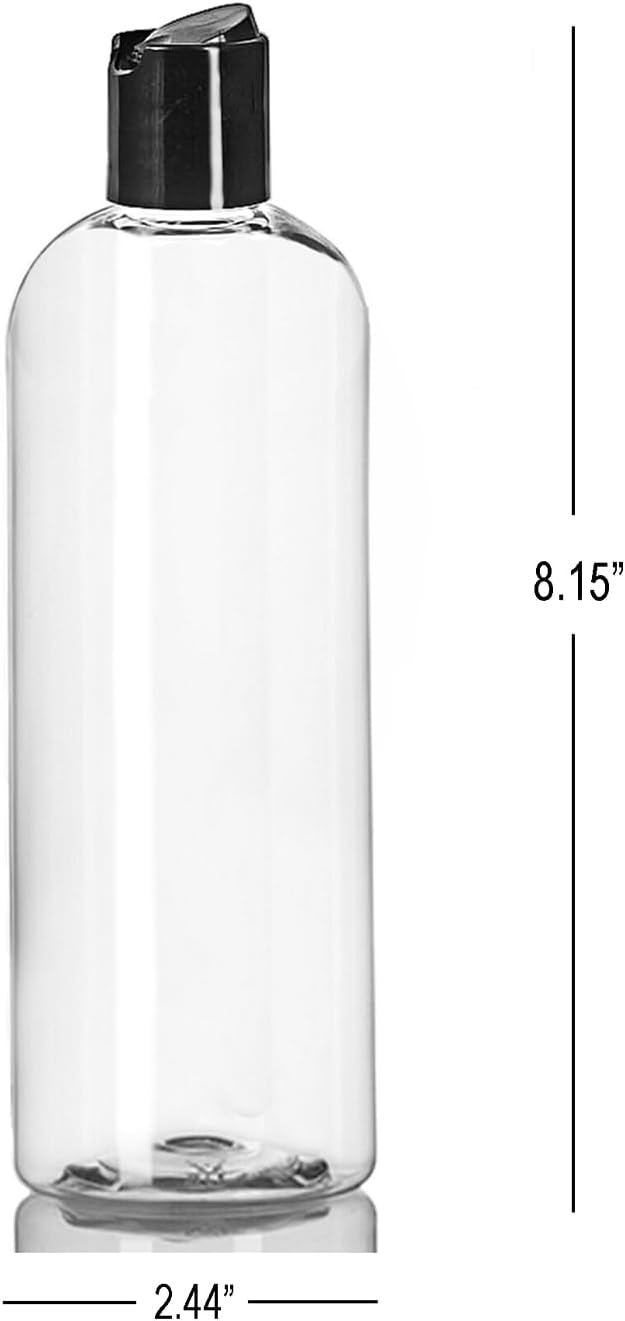 Clear squeeable plastic bottles equipped with black polypro disc top caps. These smooth black disc top caps offer easy dispensing for many products such as lotions, soaps, and shampoos.