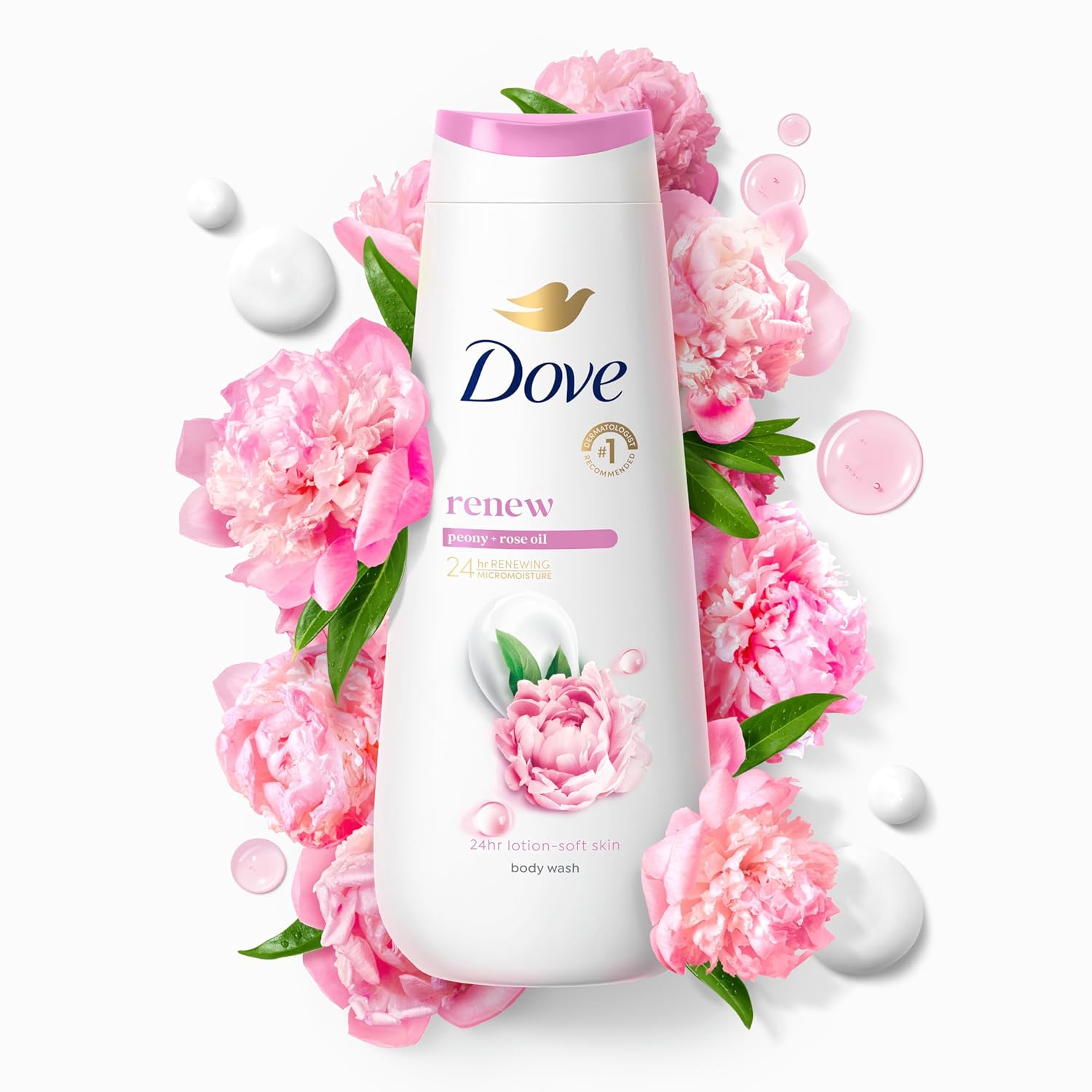 Stop and smell the roses. Oh wait, that’s you! Have a gratitude moment everyday with Dove Renewing Peony & Rose Oil Body Wash. Your skin will be petal-soft and your senses renewed. While the delicate floral scent puts a smile on your face, the hydrating gel formulated with millions of 24hr Renewing MicroMoisture droplets, skin-natural nourishers and skin-loving plant-based moisturizers are happily there to absorb deeply and work with your skin’s natural renewal process to help retain and boost moisture. You’ll step out of the shower feeling nourished and renewed with soft and supple skin. And that flower stopping power is just getting started with its inspiring scent of lacey peony infused with the softness of white musk. To use this hydrating gel formula, squeeze into palms or loofah, massage into skin, give it a little love, let the rich lather soak in, rinse and step out of shower feeling renewed and silky-smooth all over. Who else would you trust, but the No.1 dermatologist-recommended brand (us!) to deliver a long-lasting, hydrating body wash? Our Renewing Peony & Rose Oil Body Wash is vegan and Dove is PETA approved, meaning we do not test on animals anywhere in the world. Plus, it’s sulfate-free, paraben-free, and packaged in 100% recycled bottles.
