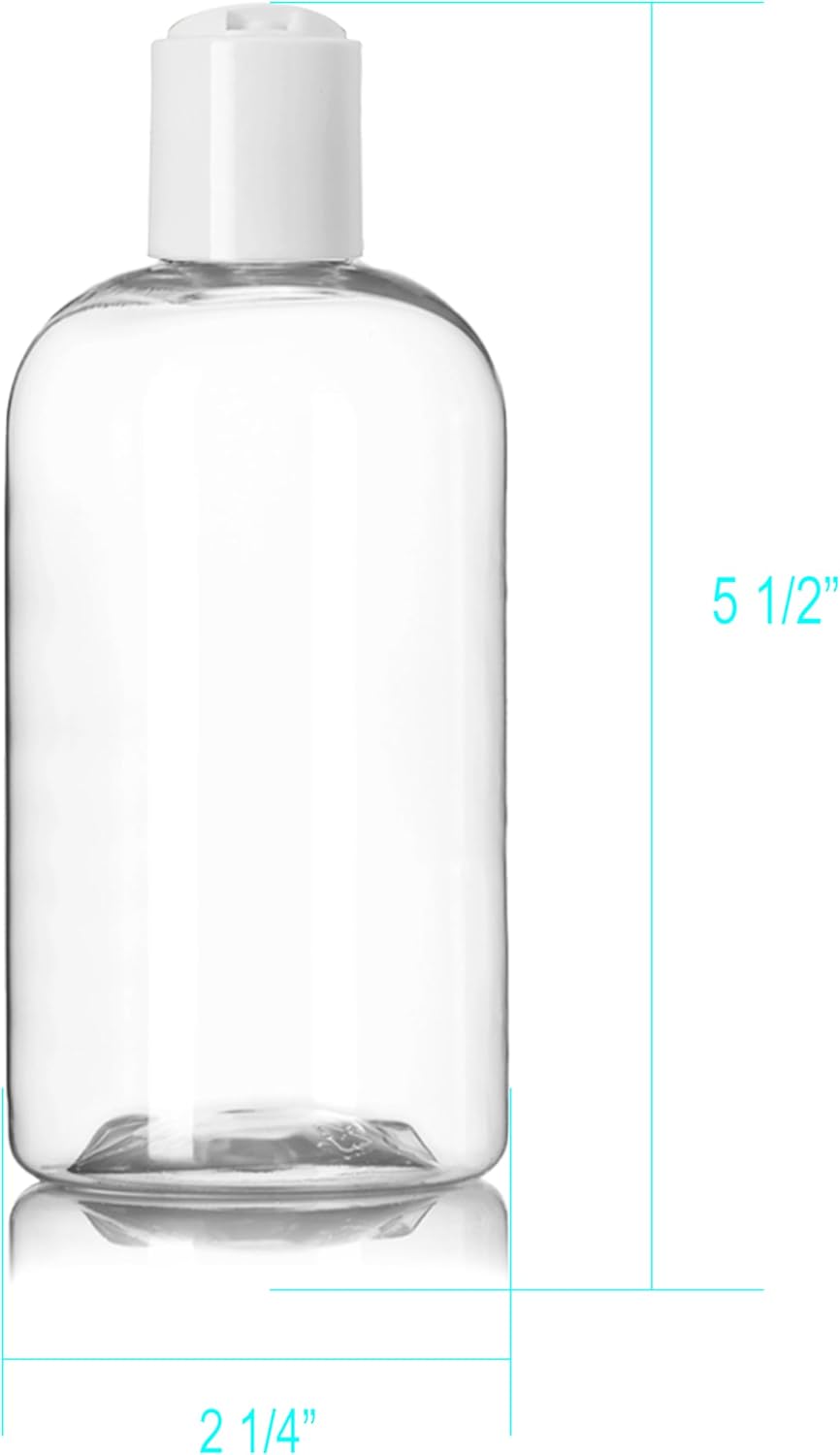 These 8 oz clear plastic bottles with white disc top caps are perfect for storing and dispensing a variety of liquids like shampoos, lotions, creams, and more. Made in the USA from BPA-free plastic, they’re lightweight, squeezable, and reusable—ideal for both home and travel use. Comes in a convenient 2-pack.