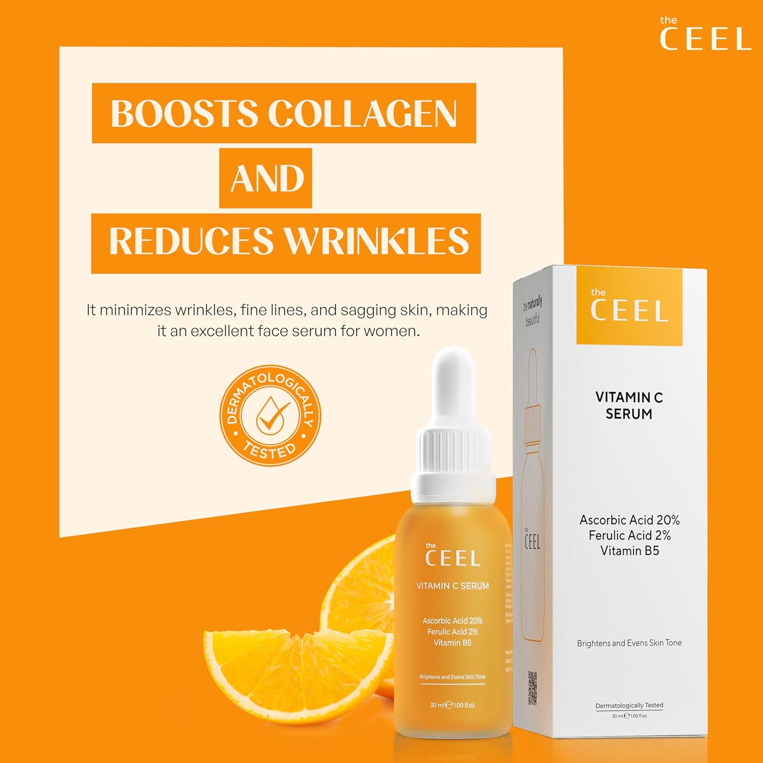 Brightens and Evens Skin Tone: The Ceel Vitamin C Face Serum with 20% Ascorbic Acid, Ferulic Acid, and Vitamin B5 reduces dark spots, sun damage, and pigmentation. This hydrating serum for women is ideal for face brightening, skin tightening, and achieving even skin tone effortlessly.