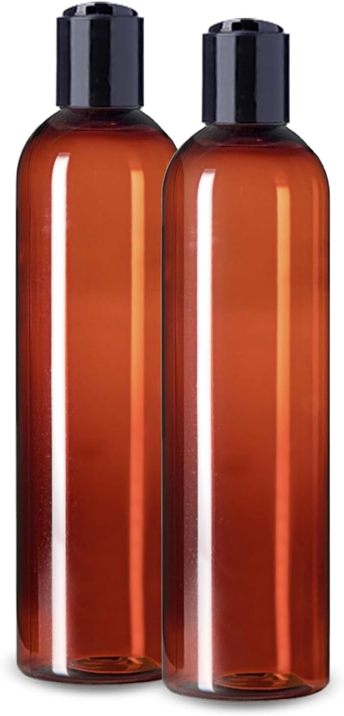 ljdeals 8 oz Amber Plastic Empty Bottles with Black Disc Top Caps, Refillable Containers for Shampoo, Lotions, Cream and More, BPA Free, Pack of 2, Made in USA