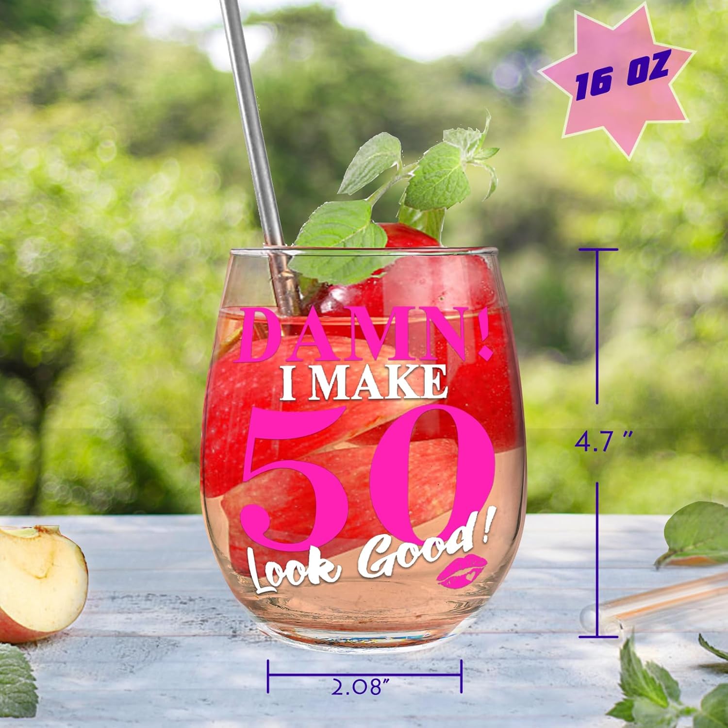 Celebrate the big 5-0 with this unique, humorous wine glass! Featuring the bold phrase, “DAMN! I MAKE 50 Look Good!”, paired with a fun pink lipstick print, this 16oz glass makes the perfect gift for any woman turning 50.