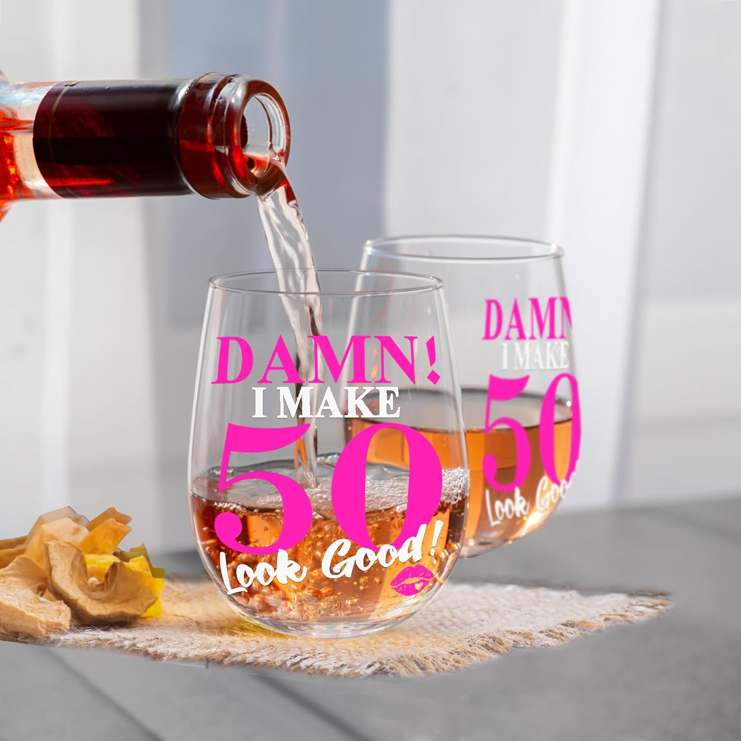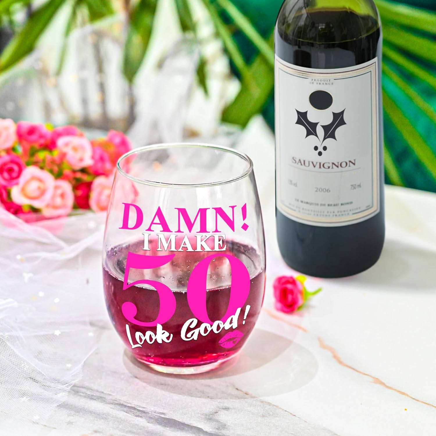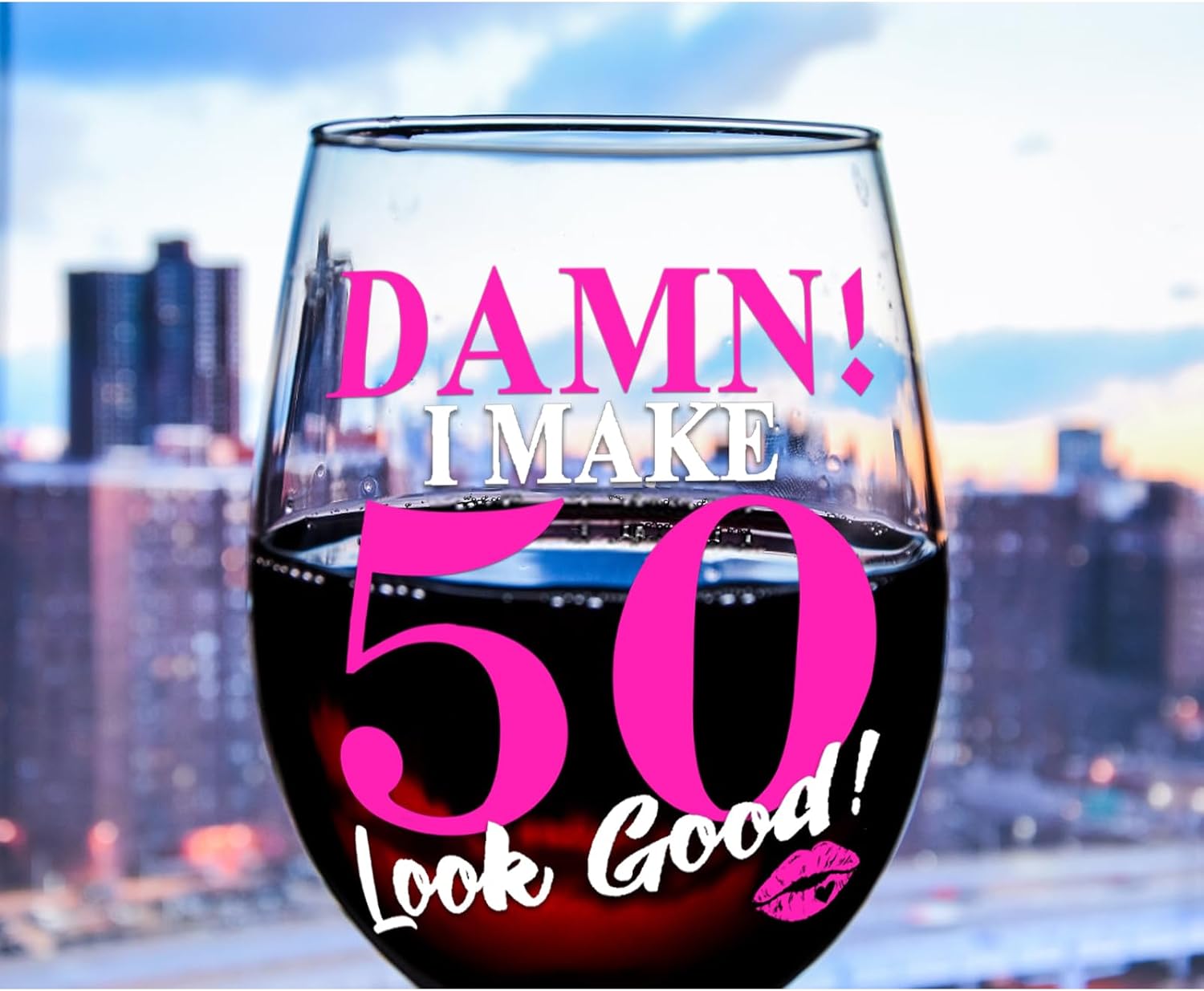 【Chic & Fun Design】 – The pink “DAMN!” and “50” alongside the lipstick print give this wine glass a playful, modern look, making it a great addition to any birthday party decor or as a unique keepsake.