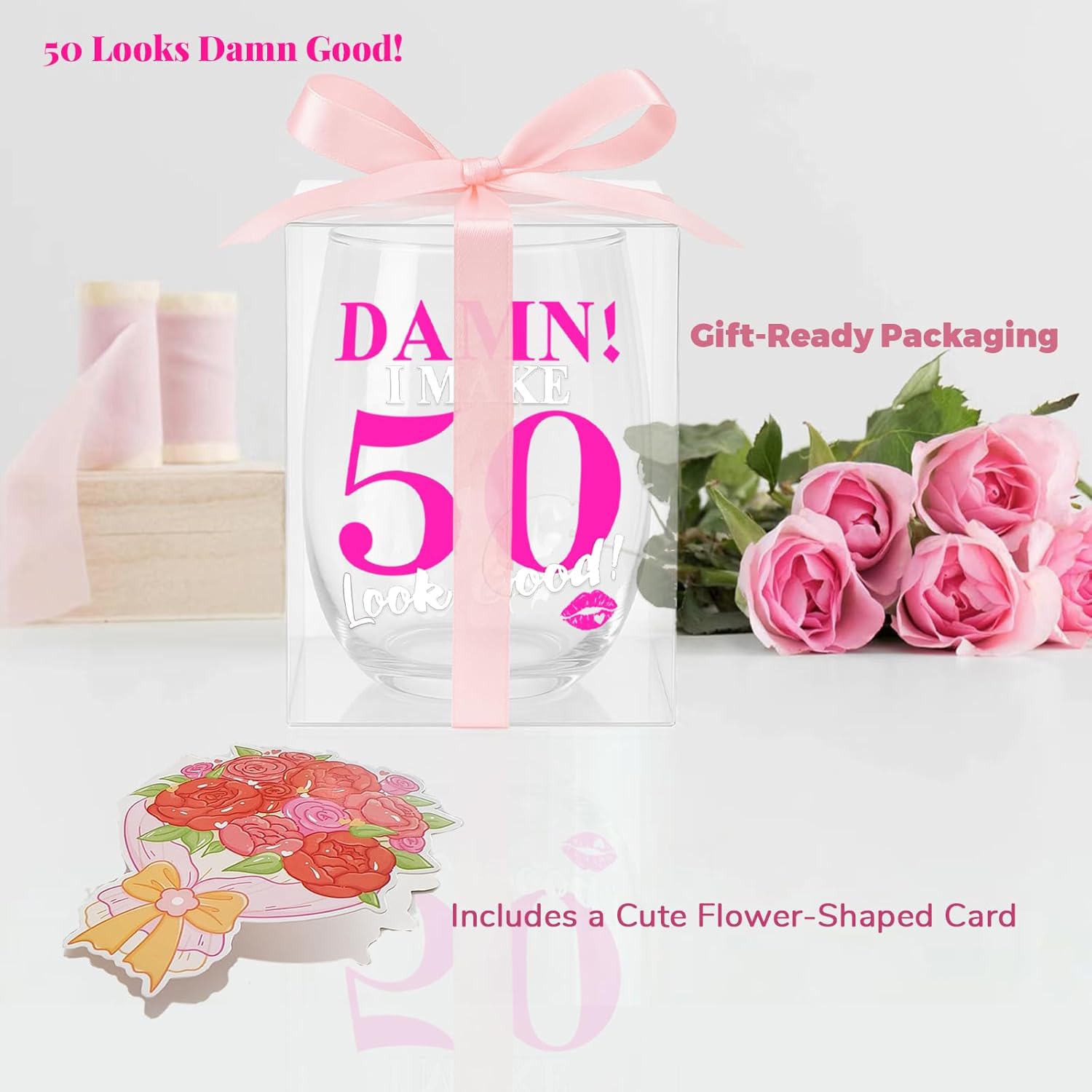 【50th Birthday Statement】 – Celebrate turning 50 with flair! The “DAMN! I MAKE 50 Look Good!” print paired with a playful lipstick mark makes this wine glass a fun, eye-catching gift for any woman.