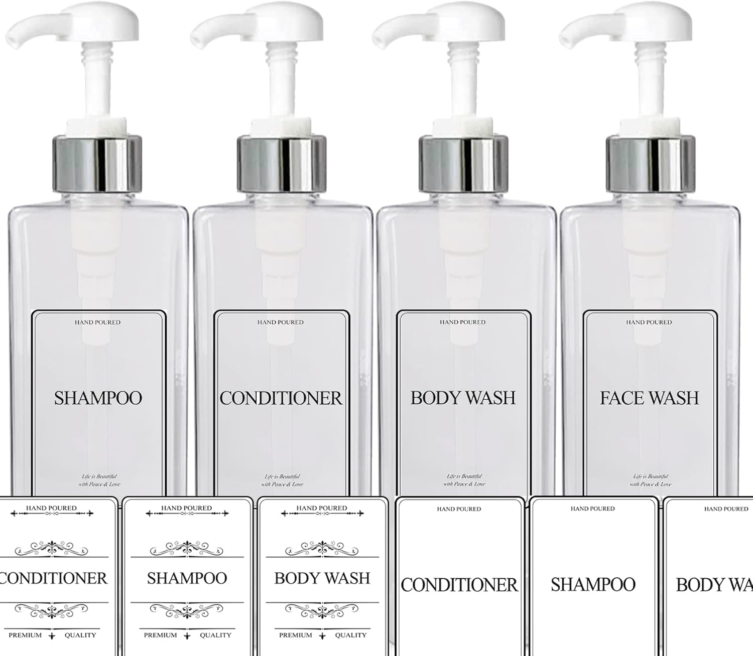 【Reasonable Capacity 800 ML / 27 oz】 Each dispenser 800ml bottles holds 27oz large capacity to meet the whole family essential need. Box includes: labels to identify which lotion you use: Shampoo, Conditioner, Body Wash and Soap Conditioner for Shower.