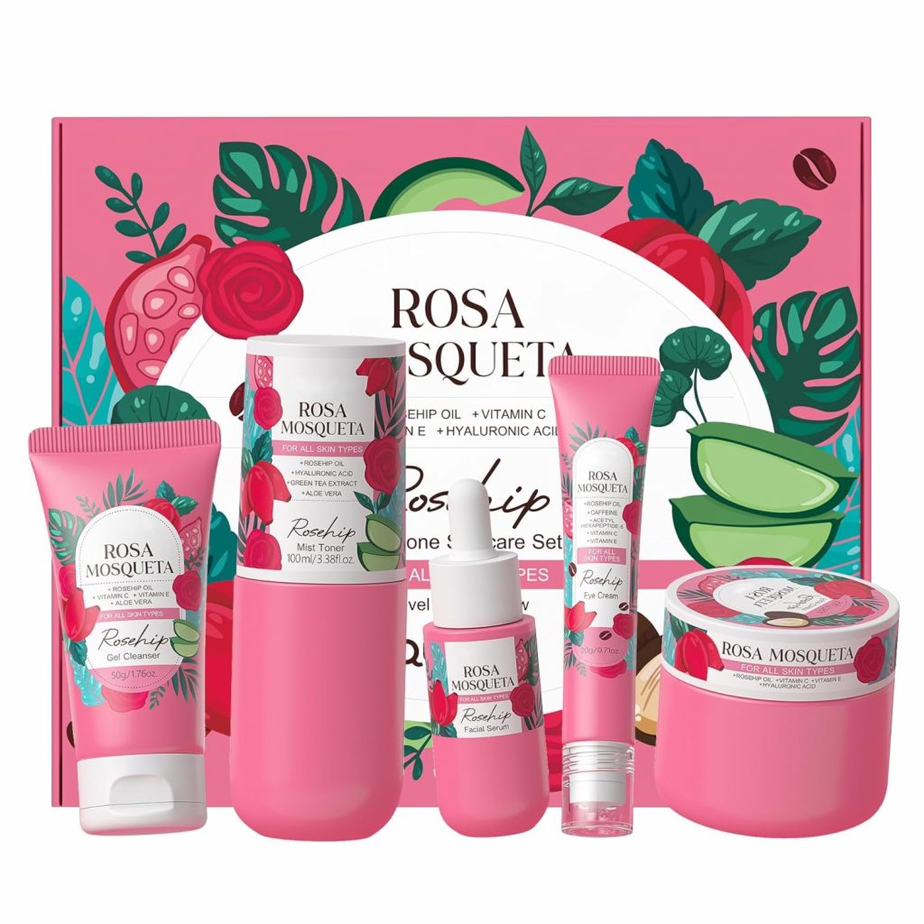 Rosehips Korean Style Skin Care Sets, Skin Care for Women Teens Girls, Beauty Skincare Gift Sets, with Gel Cleanser, Toner, Serum, Eye Cream, Moisturizer, Hydrates, Smoothes, Evens Skin tone