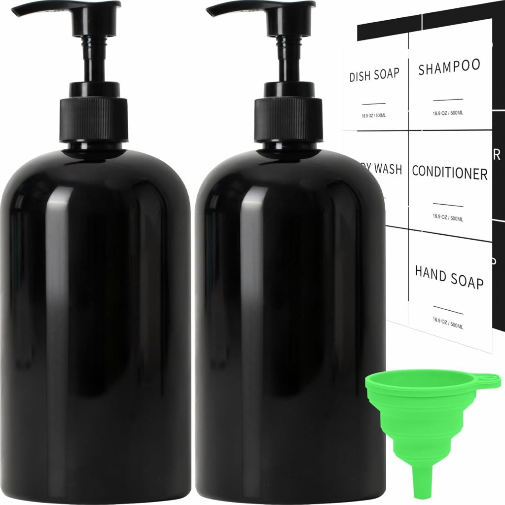 Soap Dispenser with Waterproof Labels, Thickened Plastic Hand Soap Dispenser for Bathroom, Kitchen Dish Washing Liquid Bottles, Shampoo and Conditioner Bottles (16.9 oz, Set of 2, Black)