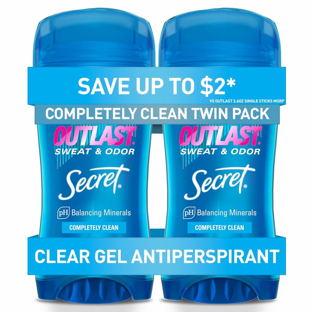 Secret Outlast Antiperspirant Deodorant for Women, 72hr Sweat & Odor Protection, PH Balancing Minerals, Clear Gel, Completely Clean Scent, 2.6 oz (Pack of 2)