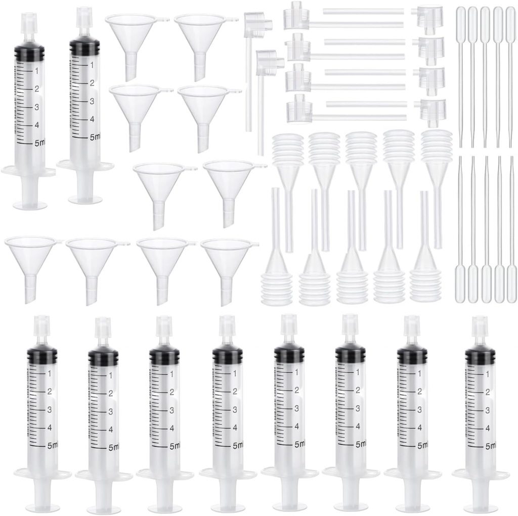 Totally 50Pcs in pack, includes 10x 5ml refill tool, 10x funnel, 10x dropper, 10x replacement